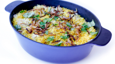 Inainte de a servi orezul, taie in felii celelalte doua cepe si prajeste-le pana ce se rumenesc. Rupe frunzele de coriandru si presara-le deasupra impreuna cu ceapa prajita.