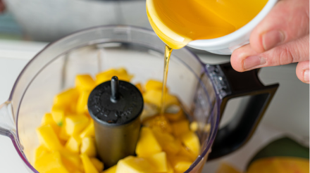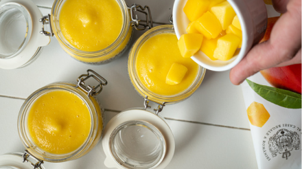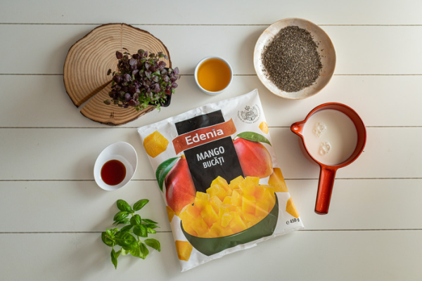 Cu cateva minute inainte sa servim budinca de chia, pregatim piureul de mango. Adaugam bucatile de mango Edenia, decongelate, intr-un mixer cu cana si o lingurita de miere si mixam bine totul pana obtinem un piure fin. Daca vrei ca piureul sa fie mai cremos, poti sa pui si o banana coapta si sa o blendezi impreuna cu celelalte ingrediente.