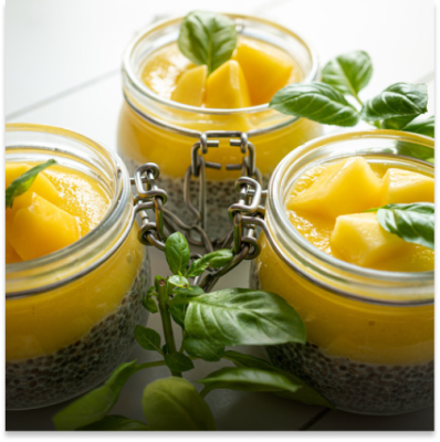 Budinca cu piure de mango, chia si busuioc este un desert minunat pentru micul dejun, mai ales prin alăturarea unor super alimente precum semințele de chia și piureul dulce de mango aromat.