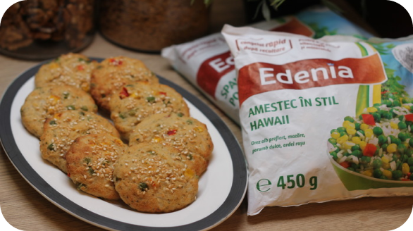 Flaveur ne propune o reteta delicioasa de chiftelute de conopida cu legume. Chiftelutele pot fi consumate in 3 zile pastrate la frigider si reincalzite in cuptor sau le putem congela pentru mai tarziu. Pentru a prepara chiftelute de conopida cu legume vom avea nevoie de produsele congelate Edenia Conopida si Edenia Amestec Hawaii. Legumele Edenia sunt curatate, sortate cu grija si congelate rapid la cateva ore de la recoltare, astfel reducandu-se considerabil pierderea vitaminelor si substantelor nutritive. Prin congelarea rapida la cateva ore de la recoltare, conopida isi mentine culoarea alba si gustul intens, usor dulce. Fiecare bucata de conopida congelata Edenia isi pastreaza forma si continutul foarte ridicat de vitamina C. Edenia Amestec Hawaii de-a dreptul delicios, contine clasicul orez alb deja prefiert, boabe proaspete de mazare si porumb, ardei rosu cubulete. Cu acest mix de legume in culori inspirate de peisajele hawaiene vom prepara chiftelutele de conopida cu legume savuroase si sanatoase.