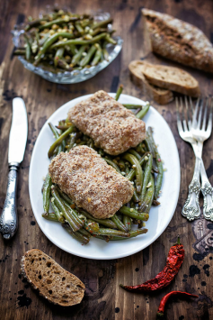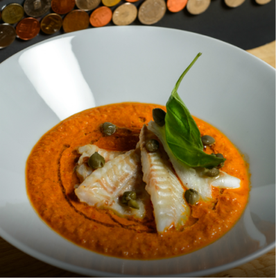 Intr-o farfurie adanca punem crema de ardei peste care asezam fileurile de cod si cateva capere. Decoram cu o frunza de busuioc.