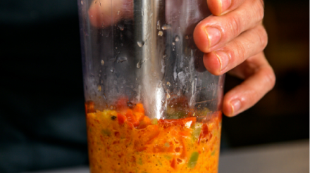 Pasam cu un blender ardeii si sosul din tava, impreuna cu busuiocul blansat, pana obtinem o crema fina.