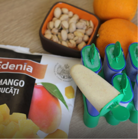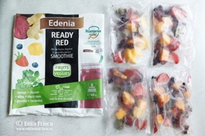 Fructele si legumele congelate sunt ambalate in 4 portii individuale si merg combinate cu suc de mere natural, lapte, iaurt de baut.