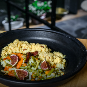 Intr-o oala incinsa adaugam untul si uleiul de masline, apoi calim ceapa si usturoiul la foc mare, pana ce usturoiul se rumeneste. Adaugam cubuletele de cartof si tarhonul, asezonam cu sare si piper, amestecam si calim inca 3 minute. Apoi stingem cu vinul alb si lasam 1 minut la foc mare, pana ce se evapora alcoolul.